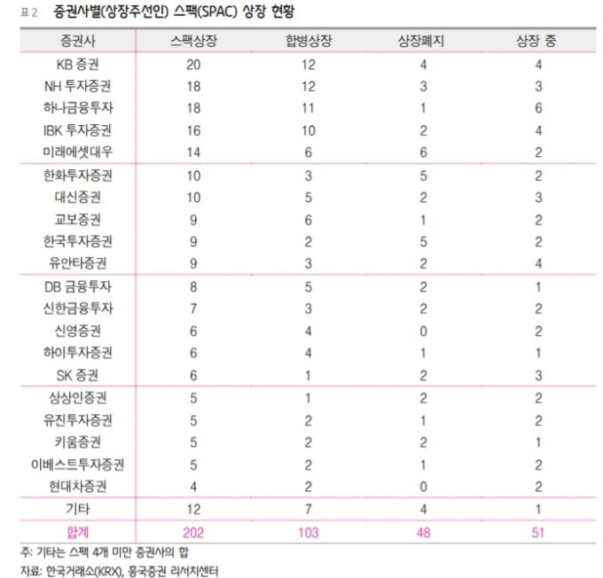 증권사별 스팩 상장 현황을 보면 아래와 같습니다. 많은 수의 상장이 이루어 졌지만 합병상장까지 된 종목 이외에도 합병을 하지 못하여 상장폐지된 것도 많이 있음을 알 수 있습니다. 그리고 현재 합병기업을 찾고 있는 상장중인 스팩 주식도 있습니다. 상장 중인 스팩주식은 현재에도 거래가 가능합니다.