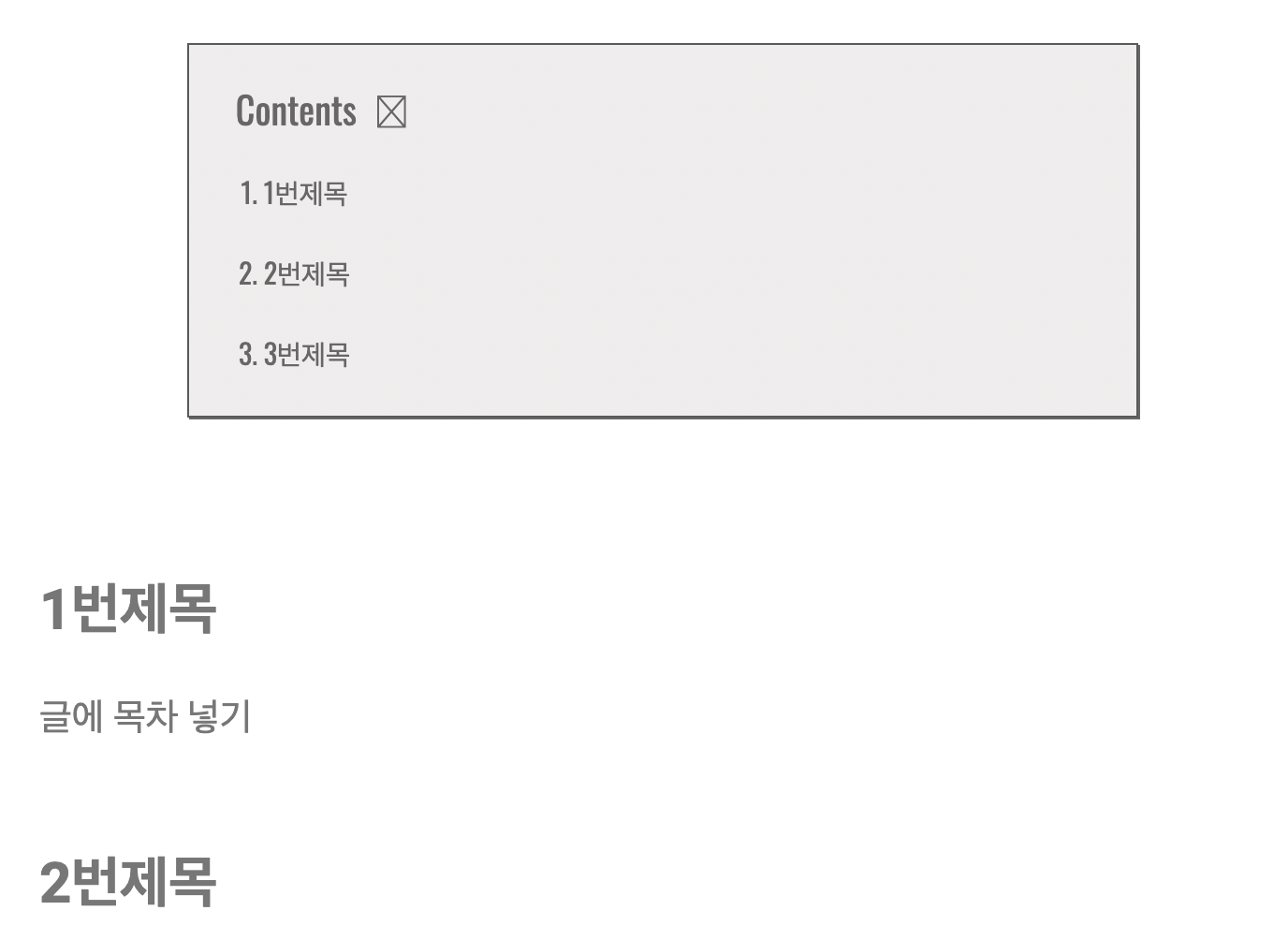 블로그에서 h2 태그로 구분한 제목을 뽑아서 목차로 만들어주는 것을 말합니다. 보통 수동으로 html 코드를 통해 넣고, 이를 위해서 css 내용도 수정을 해주어야 합니다.