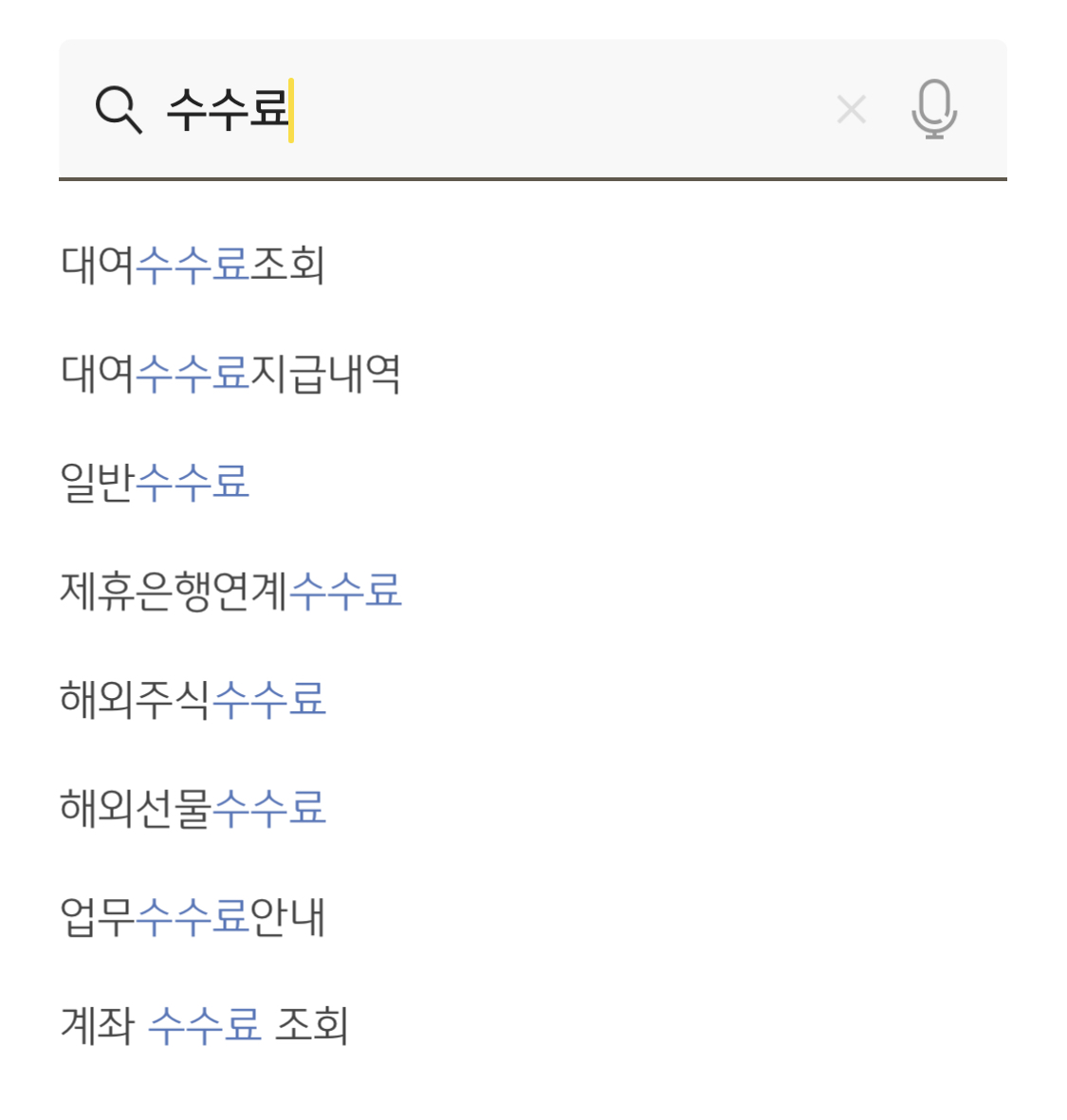 대부분의 증권사는 앱을 통해 수수료를 확인할 수 있습니다. 메뉴에서 "수수료"라고 검색하면 아래와 같이 수수료와 관련된 메뉴 항목을 검색할 수 있습니다.