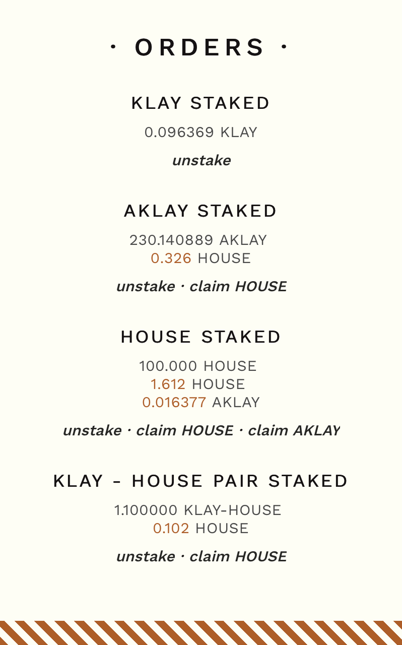 제 주문내역입니다. 너무 배불러서 탈 나지 않도록 조금만 주문했습니다. 건강에도 좋고, 여유로운 투자를 할 수 있다는 점도 좋네요. 하우스 초기 가격에 진입해서 클레이를 늘려서 늘어난 클레이만큼만 투자하는 것이라 무자본 투자나 다름없는 상황이 되긴 해서 더 마음 편한 투자입니다. 운이 좋았다고 볼 수 있지요. 정말 100% 잃어도 될만한 정도의 금액만 투자한 것이라 아주 소액이라는 걸 알 수 있습니다.