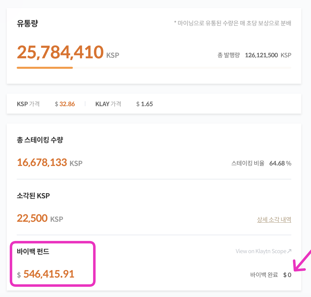 클레이스왑 업데이트를 통해서 거래수수료 중 일부를 KSP를 매입하여 소각하겠다는 계획이 발표되었습니다. 이를 위해 클레이스왑에서는 바이백펀드를 조성하고 있는 중인데 https://klayswap.com/dashboard 에서 해당 내용을 보실 수 있습니다.