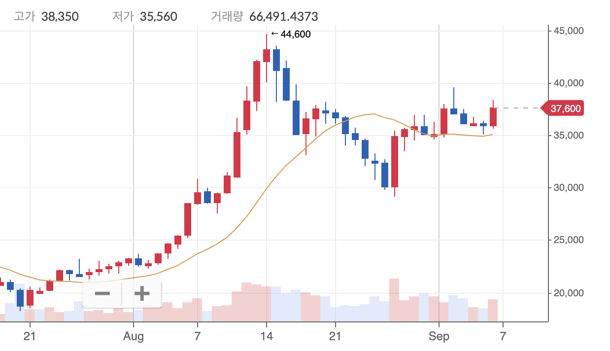현재 3만 7천 원 정도 수준인데 최근에 클레이스왑 업데이트의 영향으로 꾸준히 오르고 있는 상황입니다. 앞으로 소각이 일어날 경우 더 큰 상승을 예상하지만, 예상일 뿐 실제 소각 후 가격 변동은 아직 한 번도 없었기 때문에 기다려봐야 할 듯합니다.