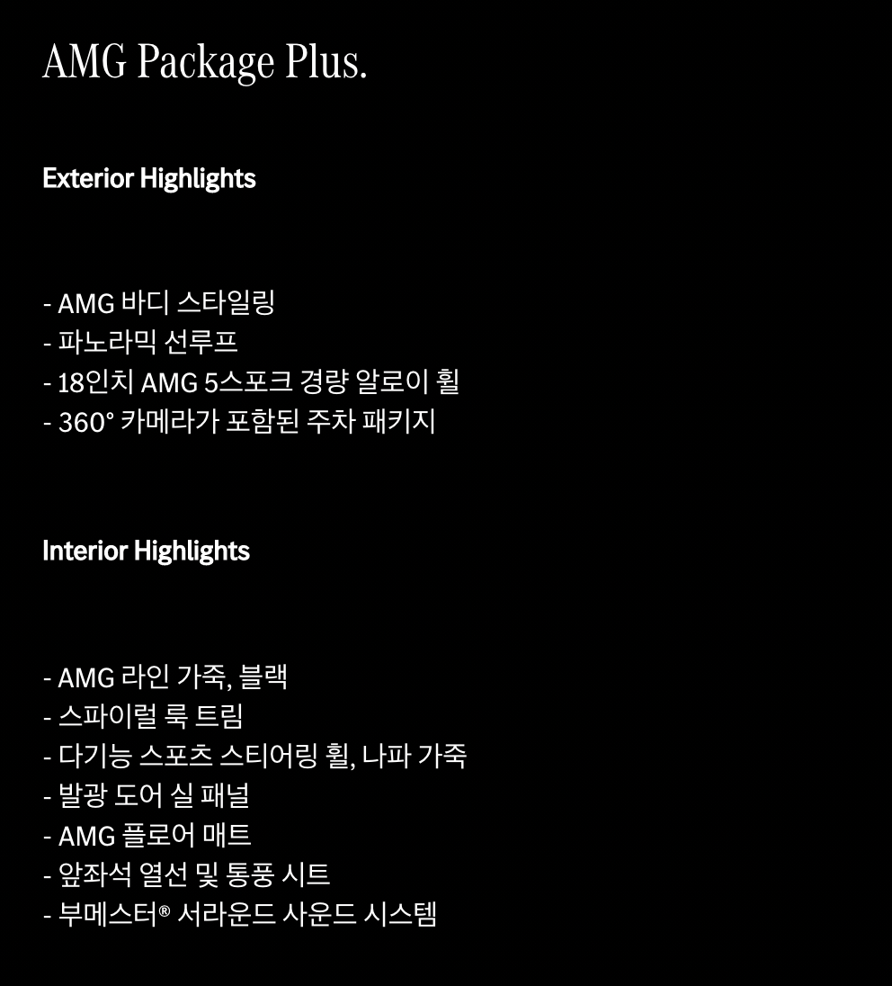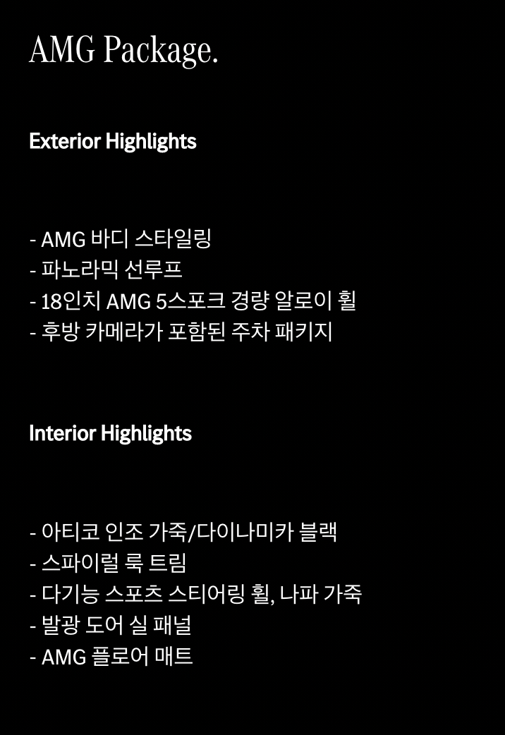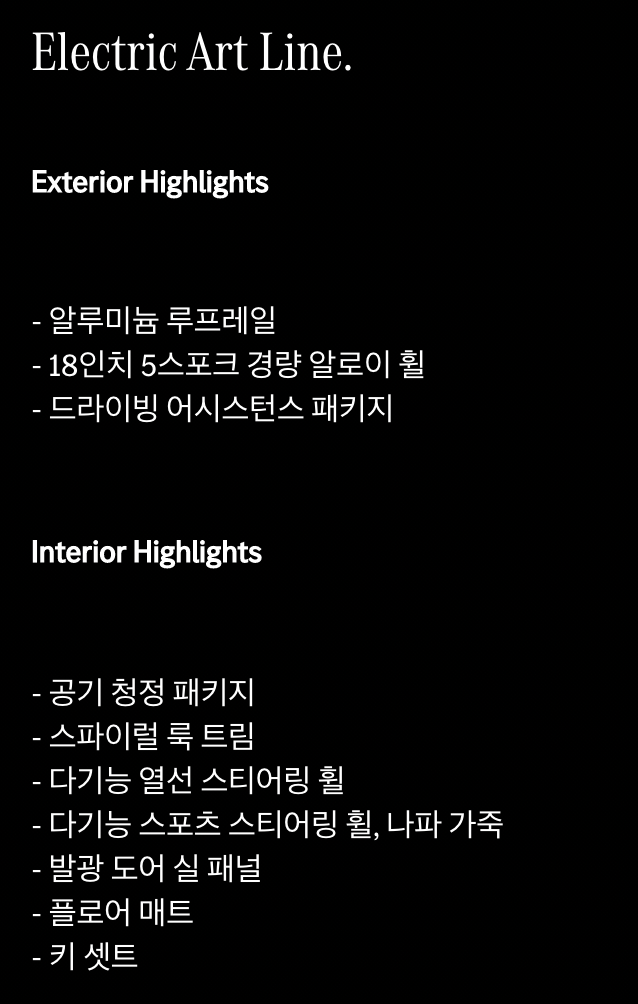 EQA는 EQA 250 단일 모델로 출시됩니다. 기본 옵션인 Art Linew과 ‘AMG 패키지’와 ‘AMG 패키지 플러스’ 옵션을 선택할 수 있습니다.