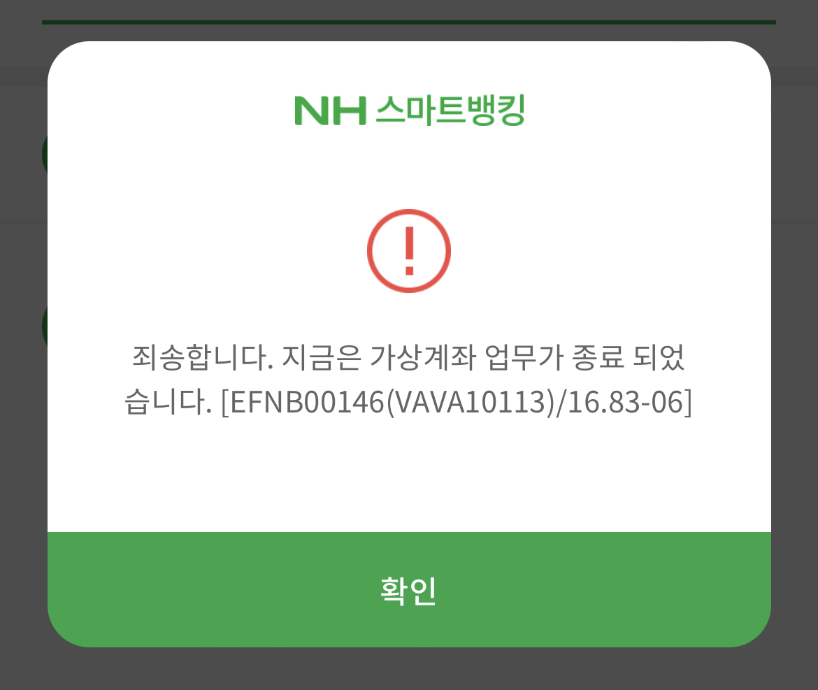 그런데 위와 같이 농협계좌를 만들어 입금을 하려고 해도 '가상계좌 업무가 종료되었습니다'라는 메시지와 함께 입금이 되지 않는 경우가 있습니다.