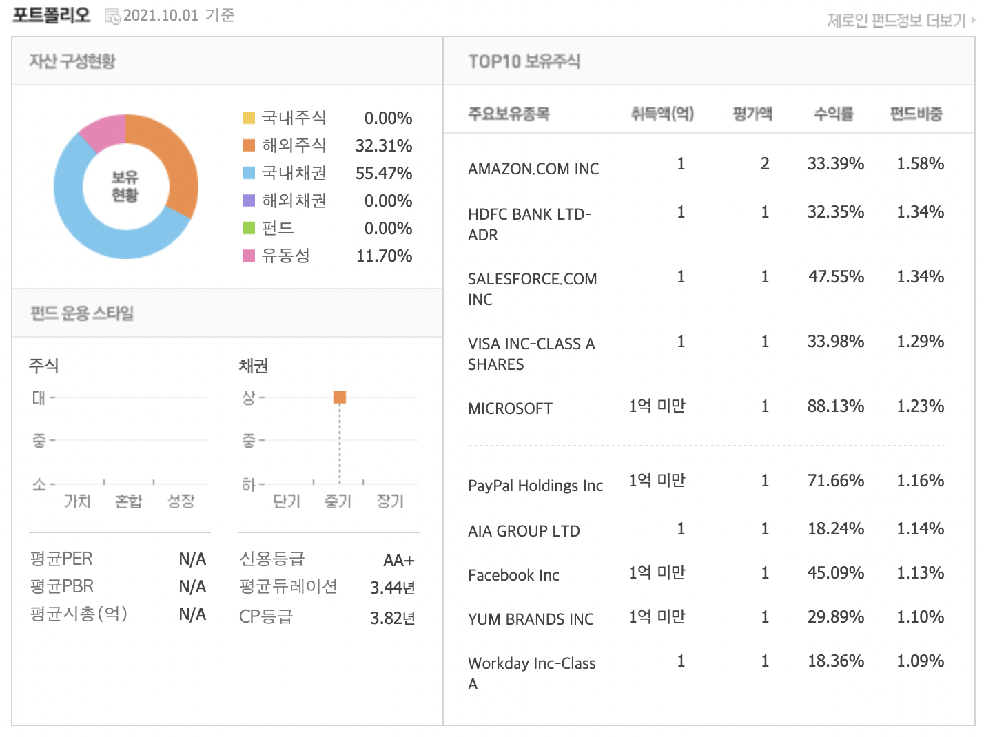어디에 투자하는 것인지 살펴봤더니 그래도 해외주식에 32%를 투자하고, 이중에 아마존과 마이크로소프트도 있어서 괜찮은 곳에 투자도 하는 펀드였네요. 이 정도면 안전자산 중에 찾을 수 있는 좋은 펀드가 아닐까 싶네요.