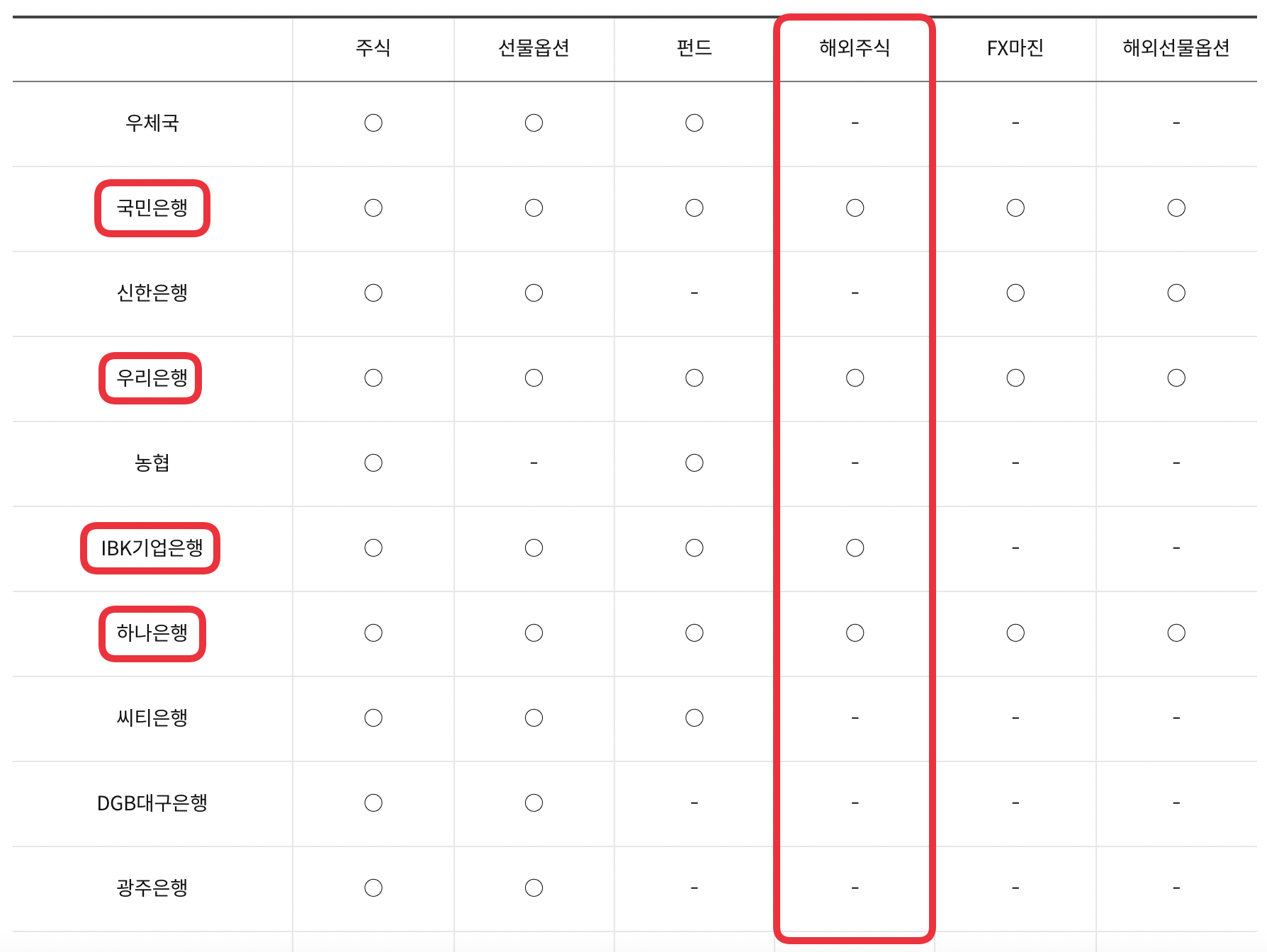 국민은행, 우리은행, IBK 기업은행, 하나은행 이렇게 4곳과 신협에서도 해외주식투자 가능한 계좌를 발급해주니 이 중에서 고르시는 것을 추천합니다.