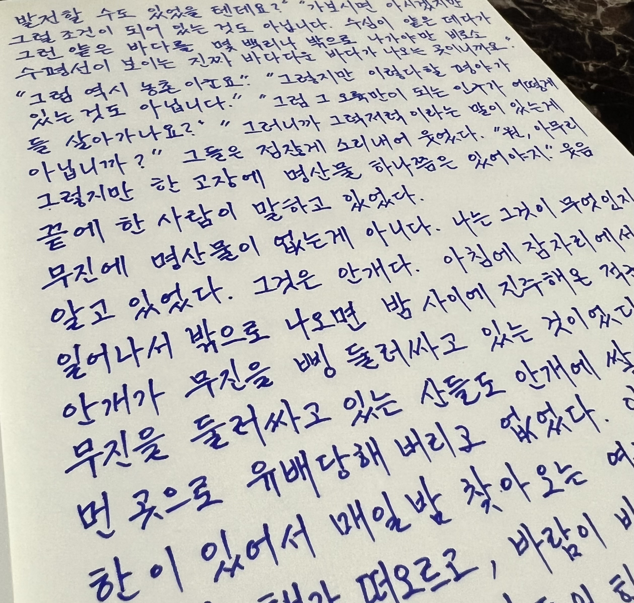 글을 쓰는 것이 저렇게 아름다운 행위인가 넋 놓고 바라본 영상이었습니다. 글을 써본지가 오래되었고, 업무노트에나 급한 대로 마구 쓰는 정도였는데, 정성스럽게 한 글자씩 눌러쓰는 모습이 참 인상적이었습니다. 한번 따라서 써보니 비록 잘 쓰는 글씨는 아니더라도 쓰는 행위 자체가 힐링이 되는 시간이었습니다.