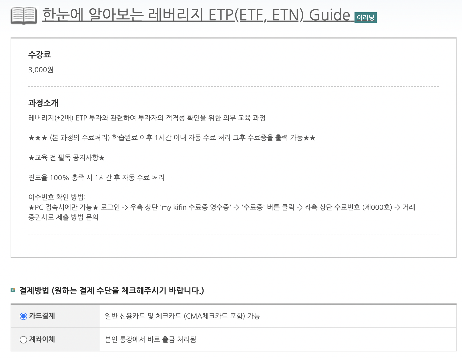 여기에서 수료증 번호를 메모해 두었다가 각 증권사에 들어가서 입력하면 그 이후에 레버리지 ETF, ETN을 거래할 수 있게 됩니다.