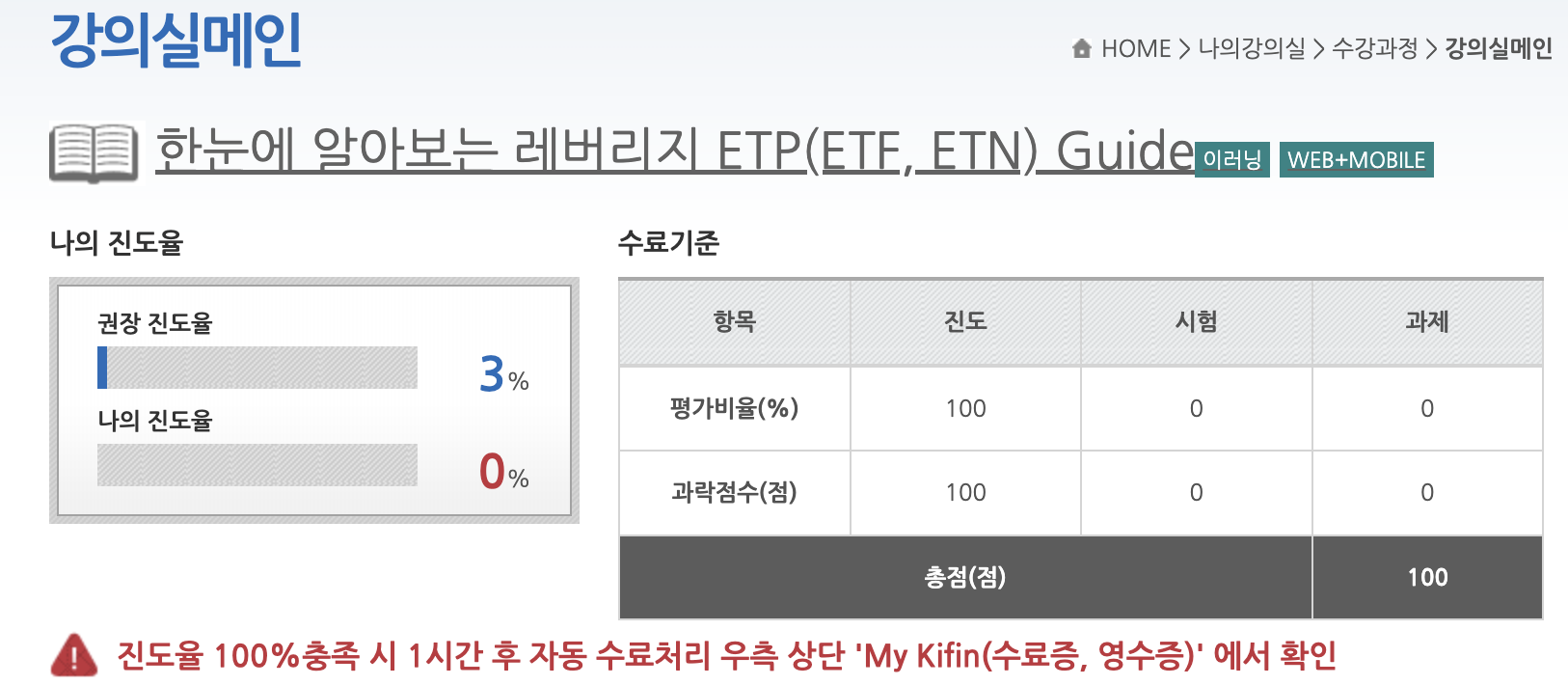 진도율 100% 충족을 하면 1시간 후에 자동으로 수료처리가 되고 수료증을 받을 수 있습니다.