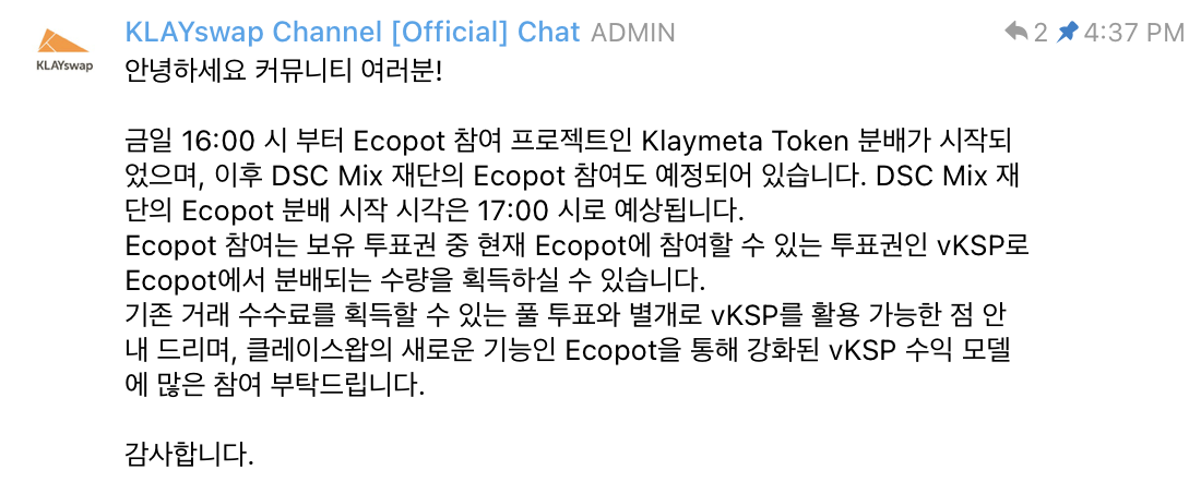- KSP 생태계 유저와 유동성과의 연결을 원하는 프로젝트는 KLAYswap 내에서 Ecopot 기능을 통해 vKSP 홀더에게 지속적으로 토큰 인센티브를 제공할 수 있고