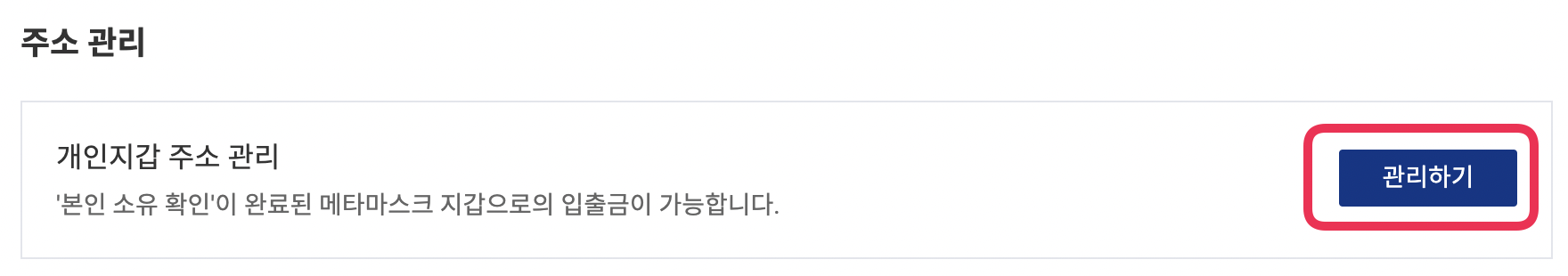 - [MY] 페이지에 접속하여 [개인지갑 주소관리]에서 [관리하기] 선택