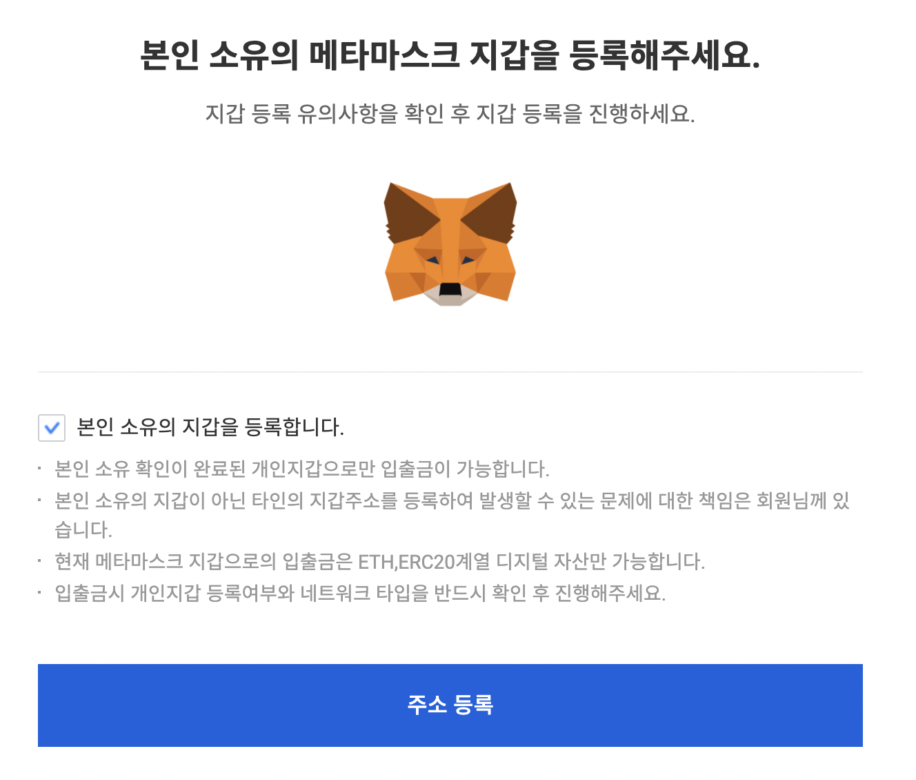 - 등록하려는 지갑이 '본인 소유 지갑'임을 확인한 후 [주소 등록] 버튼을 선택