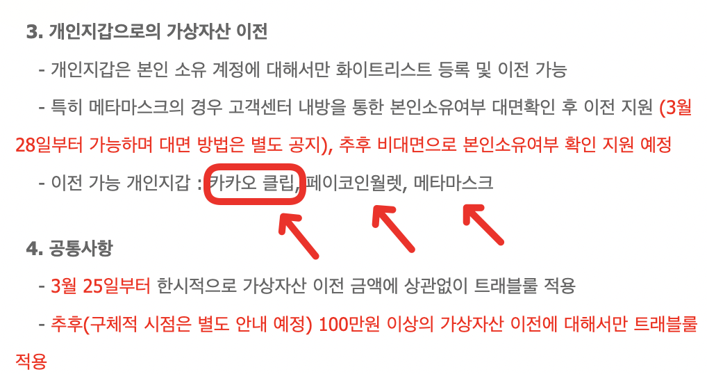 아마도 빗썸을 시작으로 업비트와 코인원, 코빗도 모두 카카오 클립 지갑을 출금주소로 허용할 것으로 기대가 되네요.