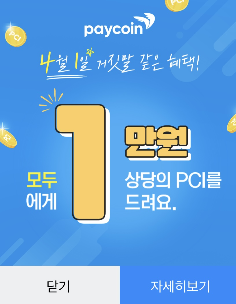 페이코인 1만 원 증정 행사를 4월 1일 단 하루 진행합니다. 아래 글을 참고해서 잘 따라서 하면 누구나 10개 이상의 페이코인을 얻을 수 있습니다. 아직 페이코인을 가입하지 않은 분들만을 위한 행사이므로 꼭 참여해보시기 바랍니다.