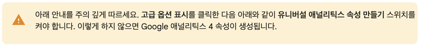 여기서 주의할점은 우리는 UA- 로 시작하는 번호가 필요하기 때문에 속성을 만드는 과정에서 "고급 옵션 표시"를 클릭한 후에 만들어야 합니다. 여기서 구글 애널리틱스 4도 함께 만들 것이냐고 묻는데 함께 만들어 두는 것을 추천합니다.