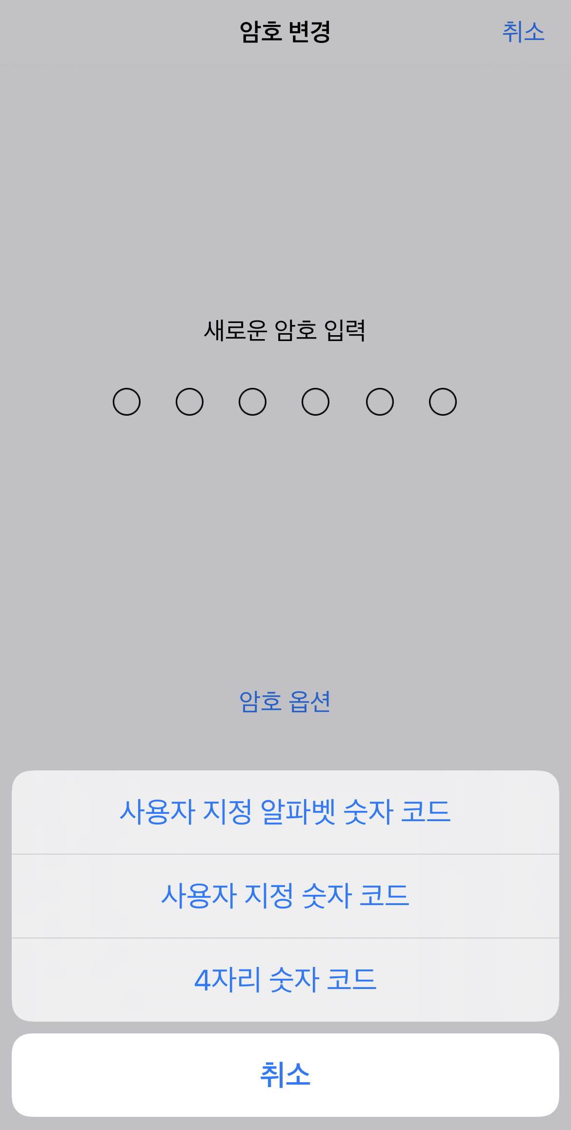 새로운 암호 입력화면이 나오면 <암호 옵션>을 탭 합니다. 아래 3가지 옵션 중에 제일 위의 것을 선택합니다.