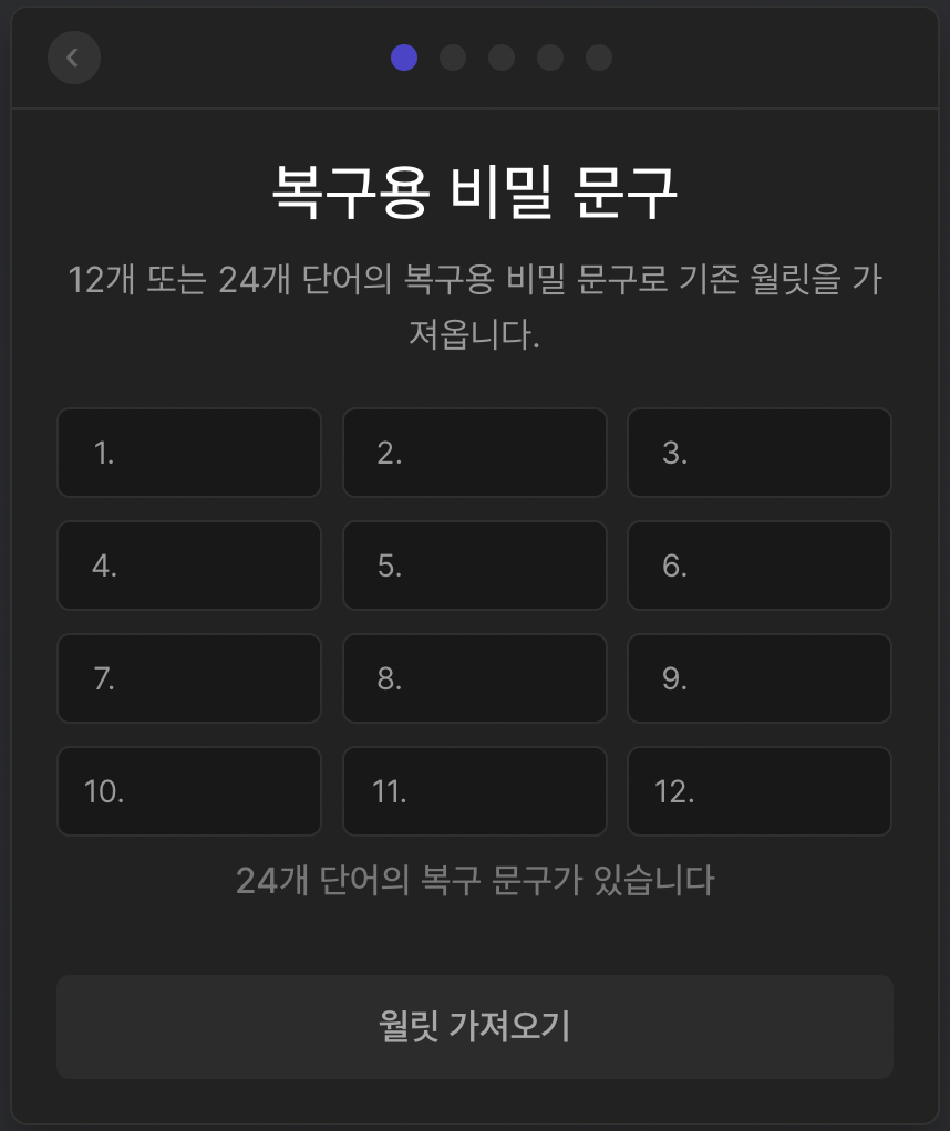 그리고 스테픈에서 지갑을 만들 때 받은 시드 구문을 아래의 화면에 입력합니다.