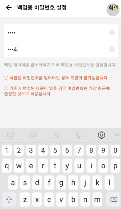백업 시, 백업용 비밀번호를 설정해야 합니다.