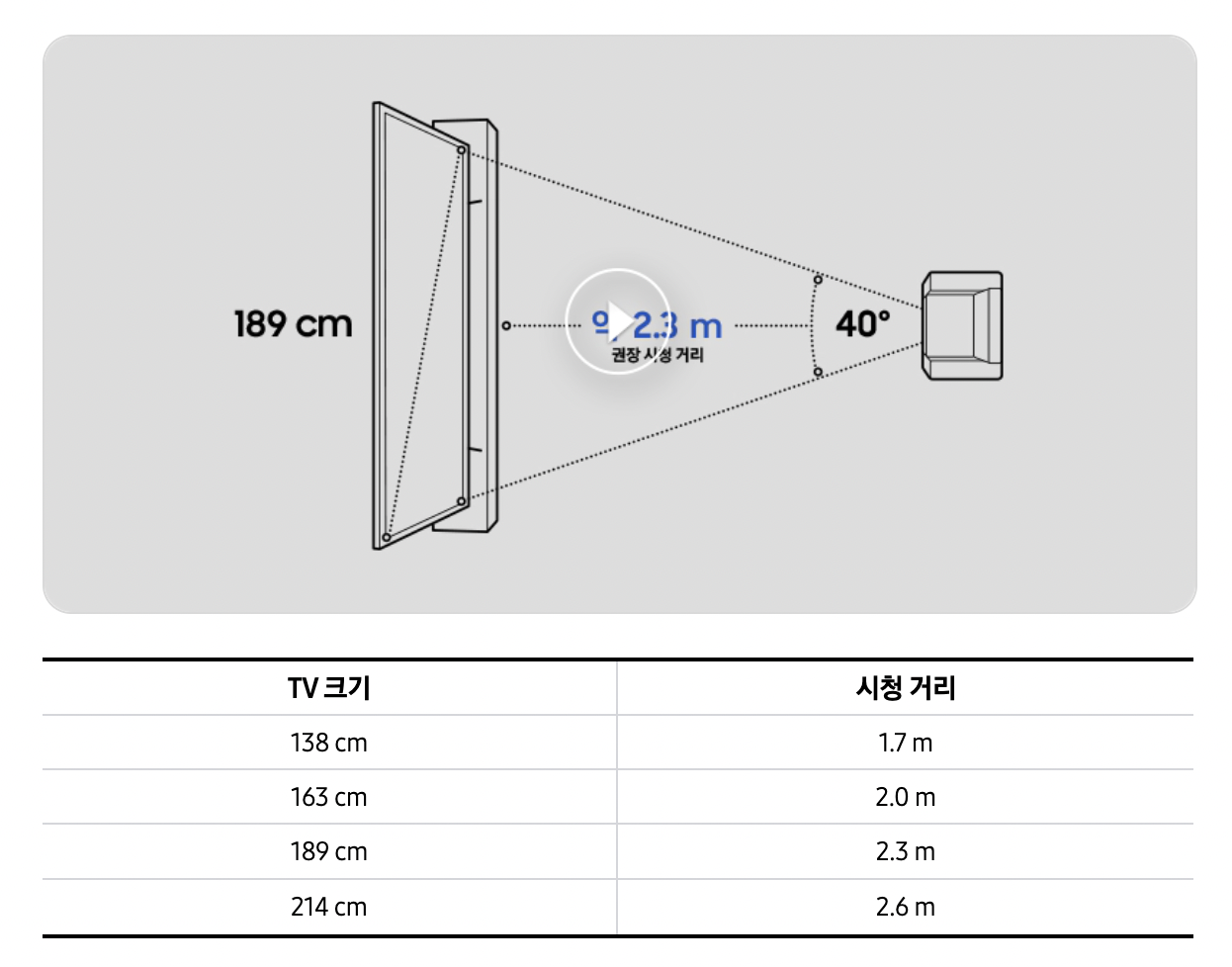 소파에서 티비까지의 거리를 바탕으로 적절한 TV 크기를 알려주는 위의 표를 참고하자.