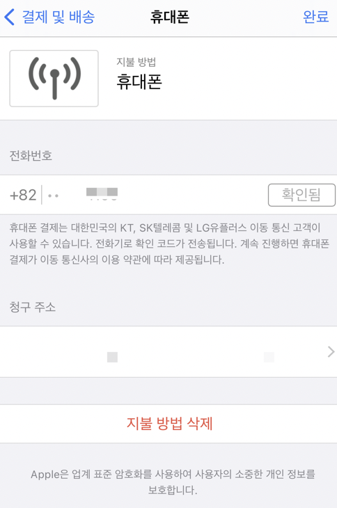 설정에서 Apple ID로 들어가서 결제 및 배송에 결제 수단을 휴대폰을 추가하면 된다.
