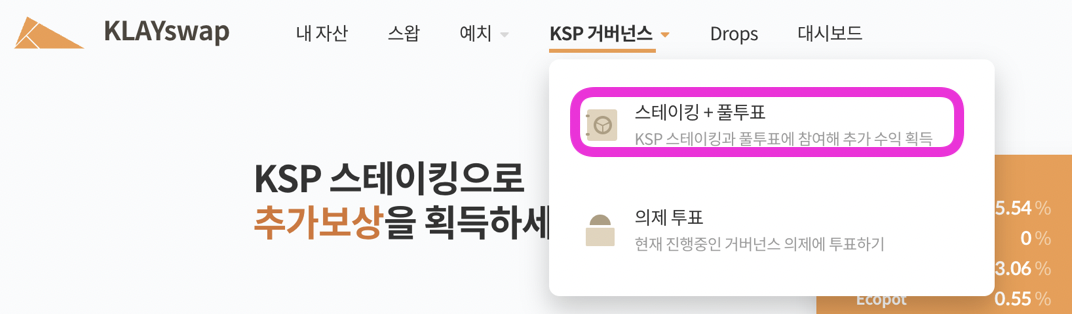 클레이스왑에 지갑을 연결하고 상단 메뉴 중에 아래를 찾아 들어갑니다.