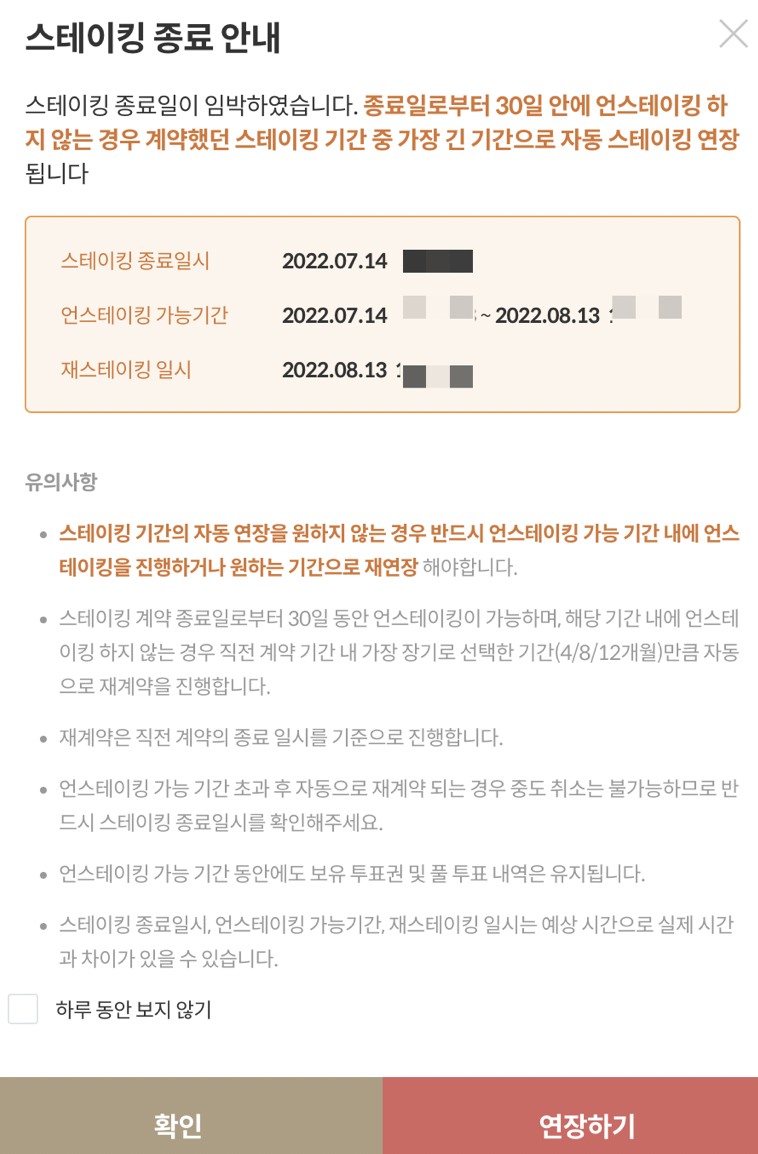 다만, 8월 13일이 지나면 자동으로 4개월 스테이킹이 자동으로 연장이 됩니다.