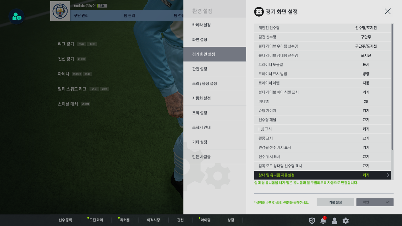 선수 위치 표기는 아래에는 끄기로 되어 있지만 '켜기'를 하는 것을 추천