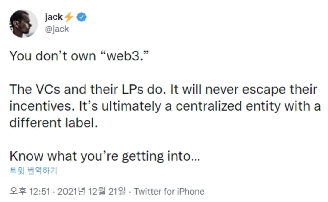 여기에 전 트위터 CEO 잭도시는 아래와 같이 이야기 합니다. 웹3는 실체하지 않는 마케팅 용어일 뿐이라고 하며 VC 들이 돈을 끌어모으기 위한 수단이라고 이야기 합니다.