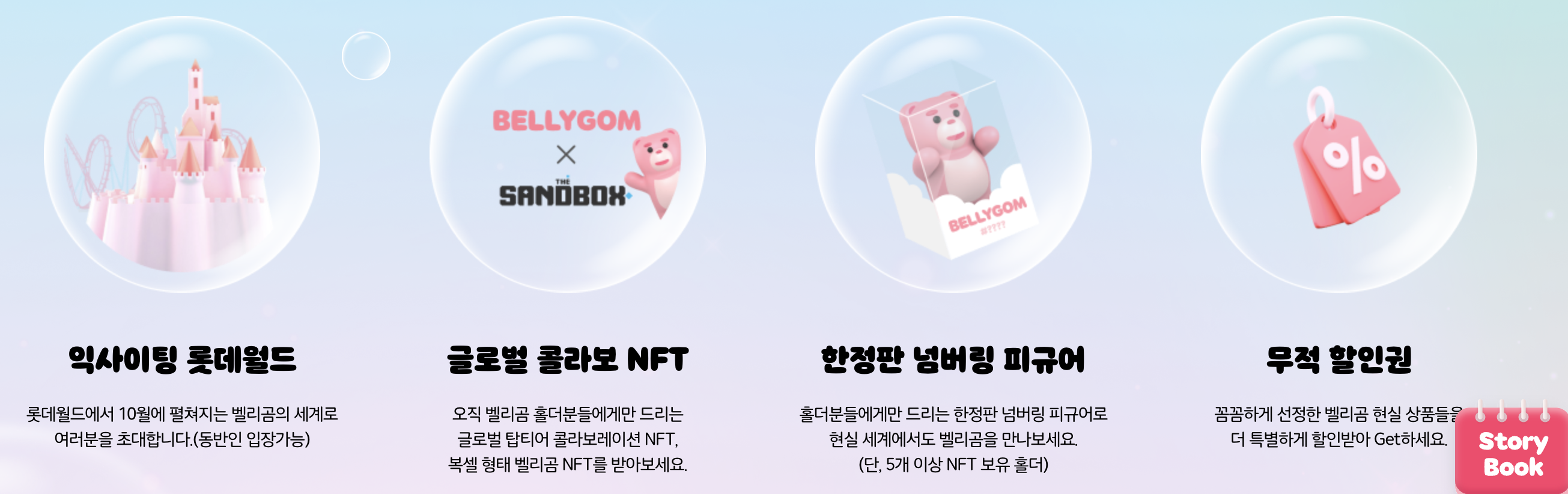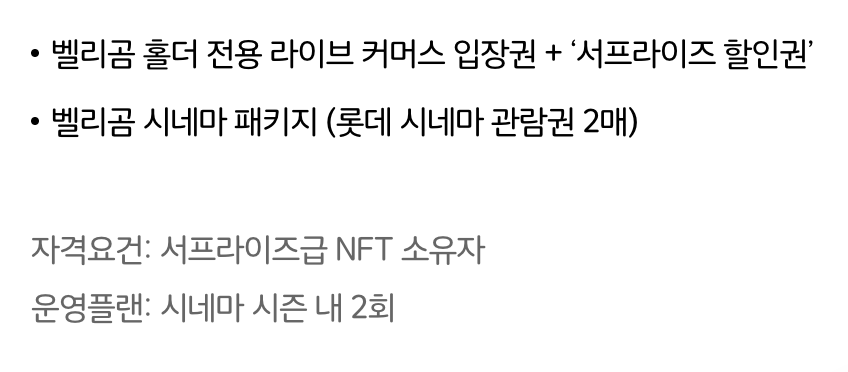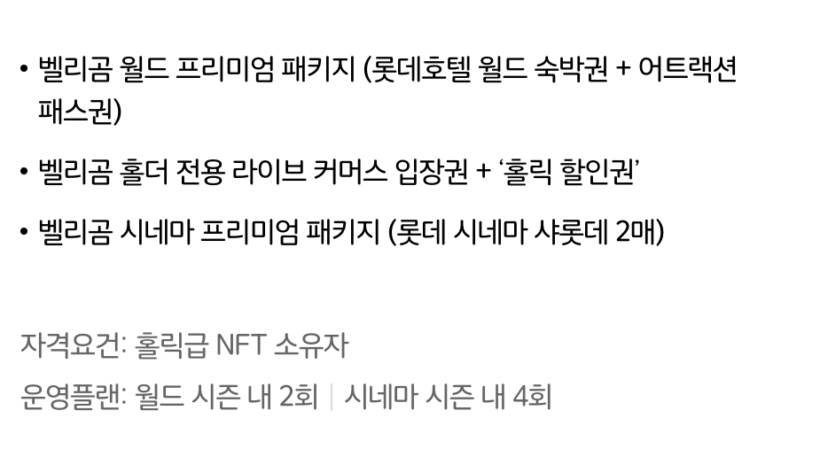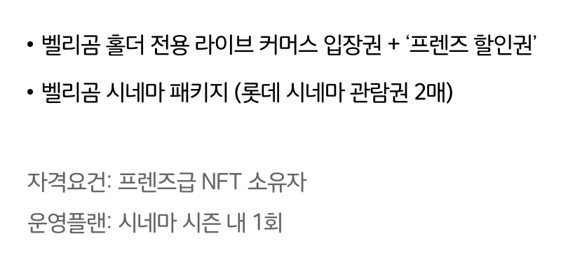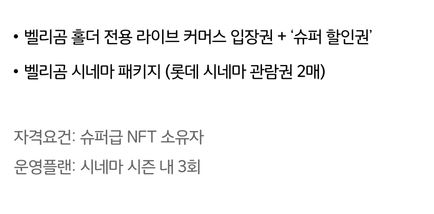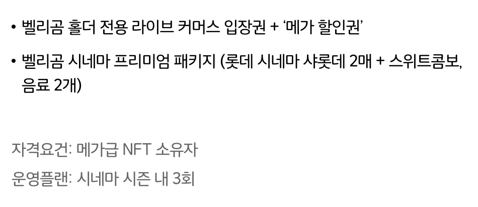 20만 원 벨리곰 NFT 하나를 가지고 있다면 1년 동안 아래와 같은 혜택을 가질 수 있습니다.