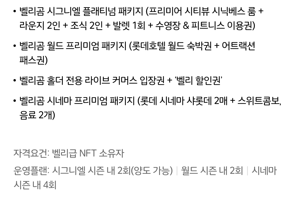 전반적으로 고급스러운 혜택 - 시그니엘 플래티넘 패키지, 롯데호텔 월드 숙박권 등-이 많이 있는 것이 눈에 띕니다. 그런데 가장 높은 벨리 등급의 경우 가격이 17만 클레이로 4천7백만 원 가까이 되네요.