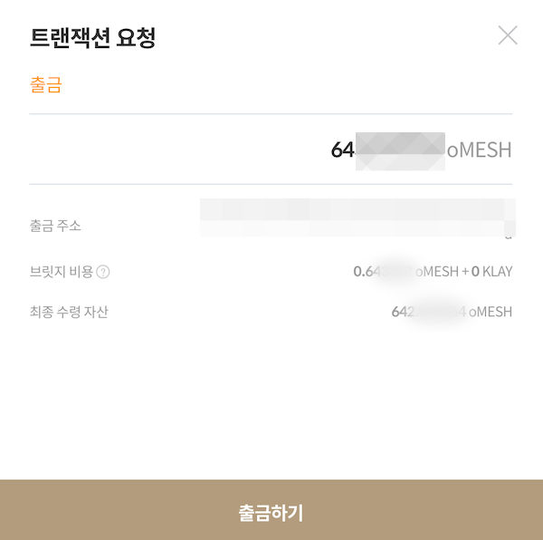 위와 같이 출금주소와 브리지 비용, 최종 수령 자산을 확인한 후 출금하기를 클릭합니다.