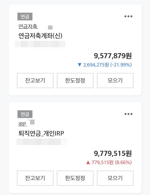 연금저축의 손실률이 퇴직연금의 수익률보다 커서 전반적으로 손해인 상황이다.