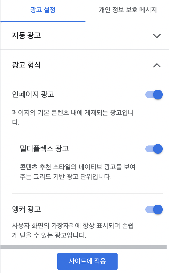 애드센스 사이트별 광고 설정 미리보기에서 아래와 같이 앵커광고를 켜거나 끌 수 있습니다.