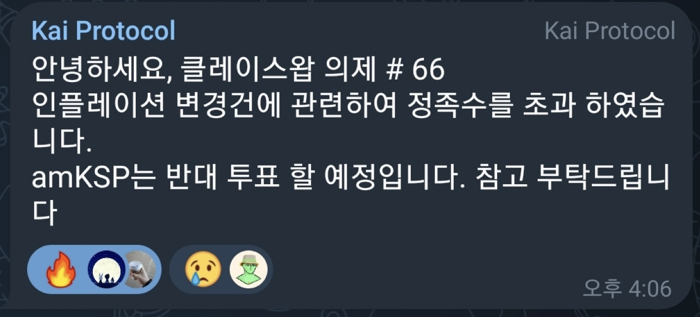 보통 의제가 등록되면 의제가 등록되었으니 투표해 달라는 정도의 메시지만 공식 텔방을 통해 전달이 되는데, 이번 안건에 대해서는 저렇게 장문의 입장을 이야기하고 있고, 여기에 대해서 분명히 "반대"의 입장을 보여주고 있습니다.