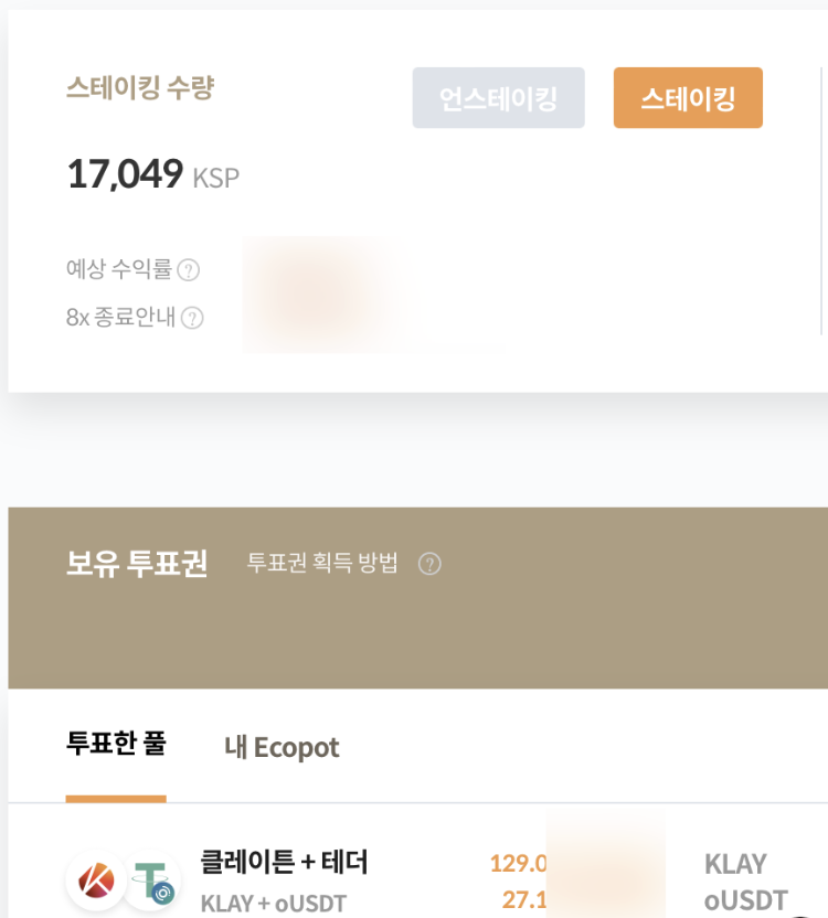 예를 들어 위와 같이 스테이킹을 하면 vksp를 통해 풀에 투표도 할 수 있고, 투표한 풀에서 이자를 두 개의 코인으로 받을 수 있습니다.