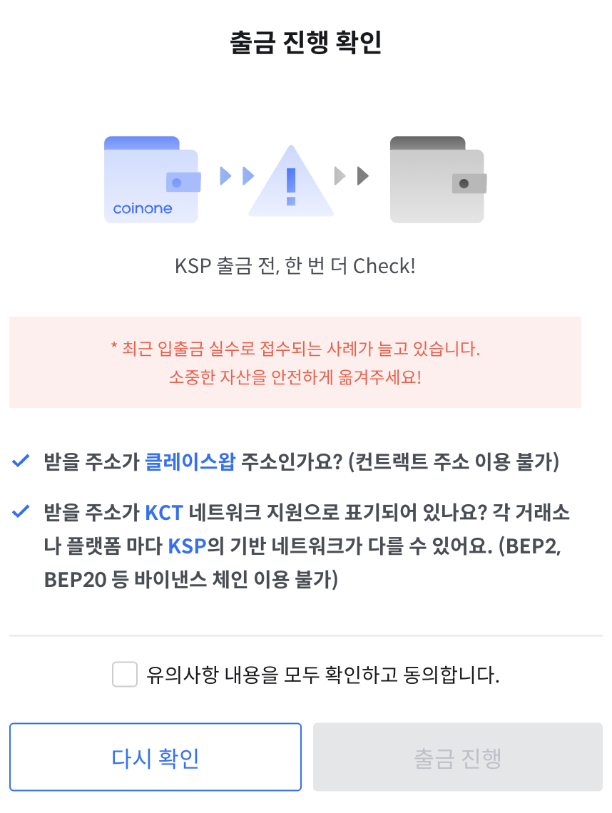 반드시 클레이스왑 출금주소와 전송네트워크(KCT)를 확인해 주세요.