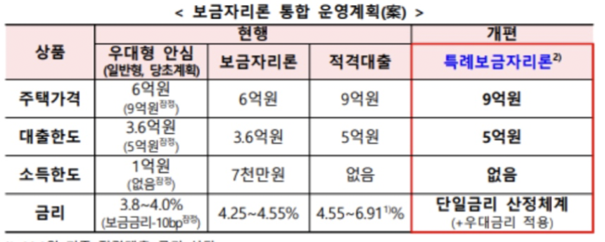 아래 표는 기존 보금자리론과 개편된 특례 보금자리내용을 한눈에 보여줍니다.
