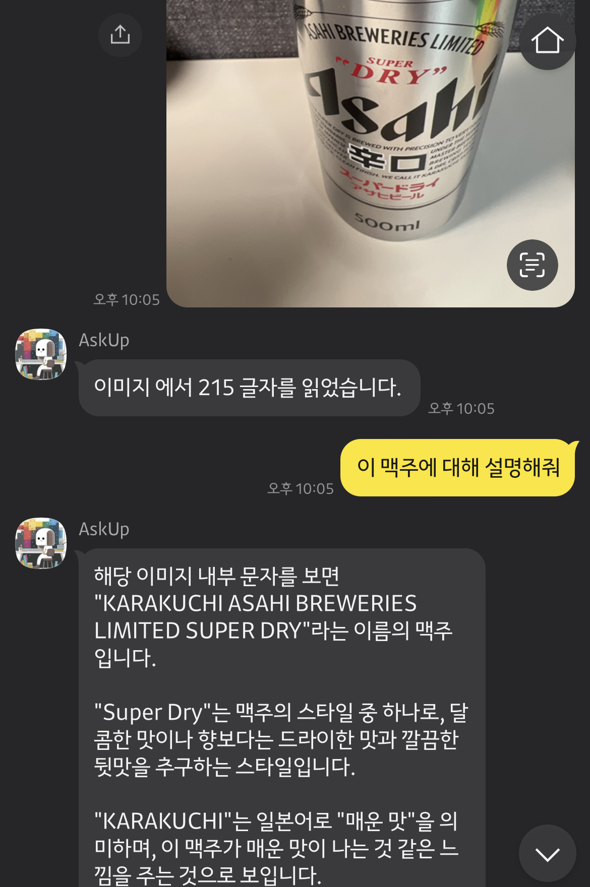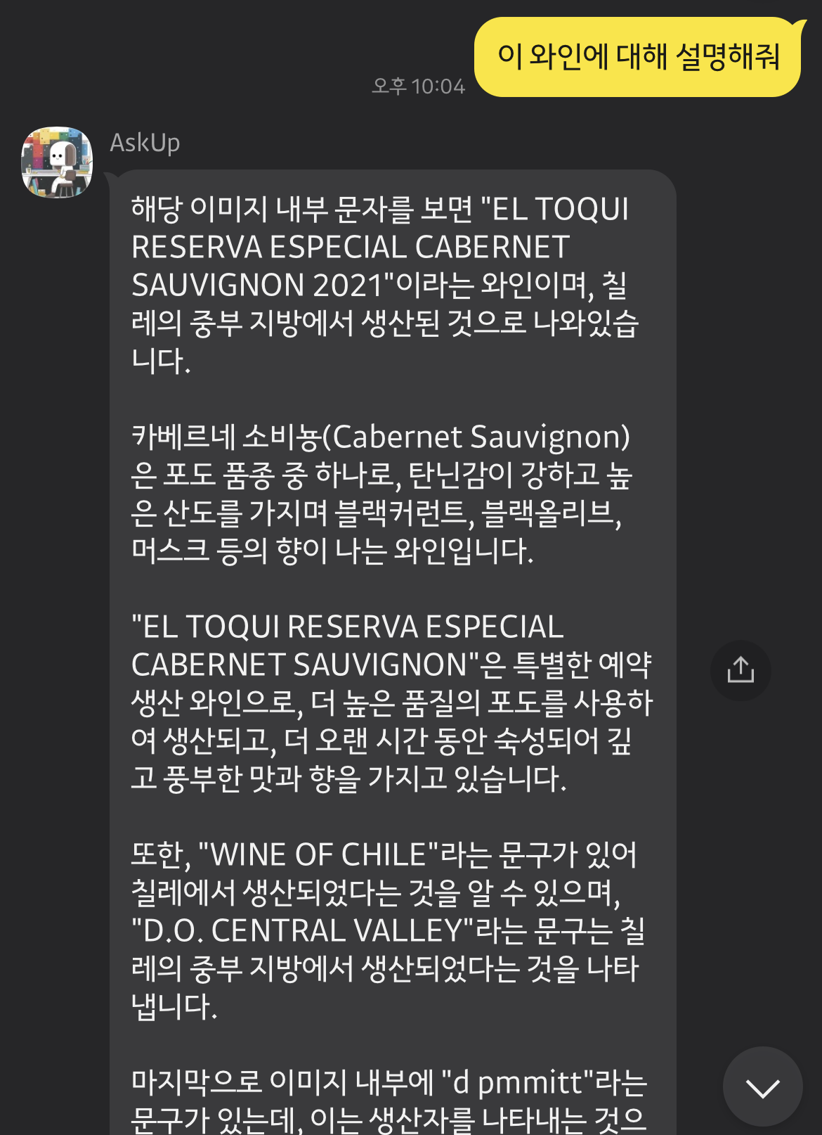 이곳을 보면 와인 사진을 찍어 올리면 해당 와인에 대해 설명을 해줍니다. 아래와 같이 말이지요.