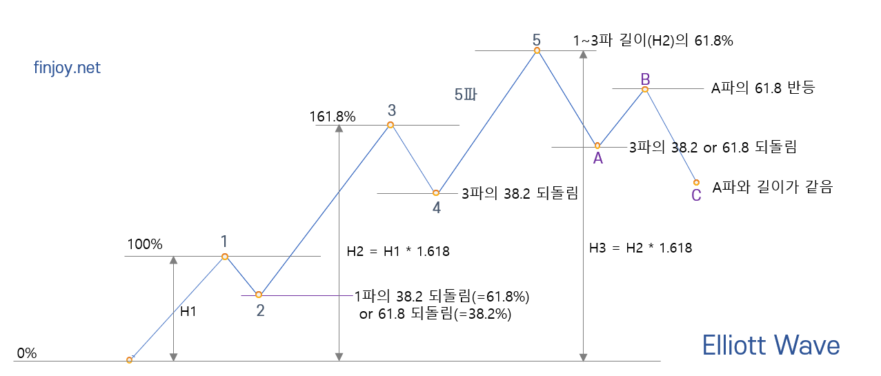 상승 5번 파동은 상승 1번 파동과 길이가 같거나, 1번 파동에서 3번 파동까지 길이의 61.8%로 형성됩니다.