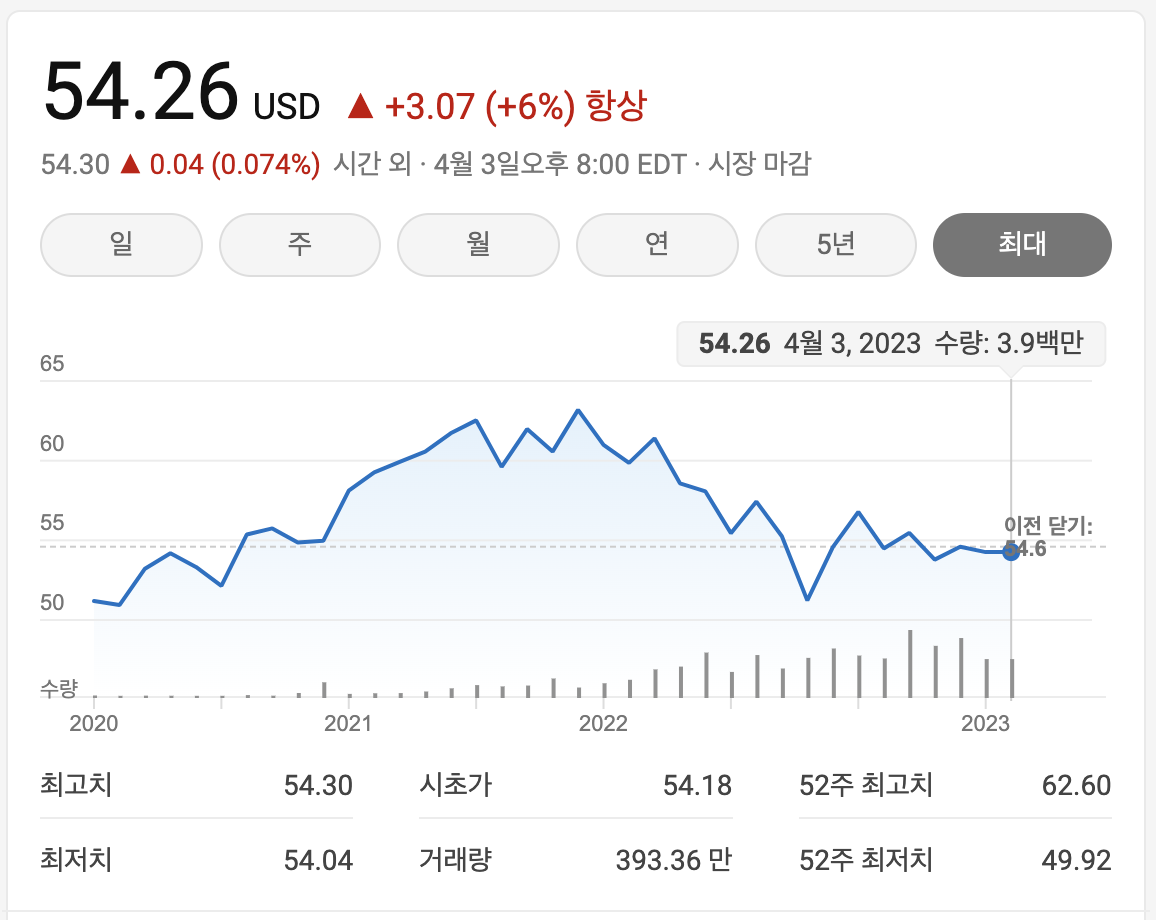 JEPI의 주가는 출시 이후 크게 변동하지 않았습니다. 현재 주가는 약 55달러 정도입니다. JEPI는 주가 상승보다는 배당금에 초점을 두고 있는 ETF이므로, 주가 수익률은 그다지 높지 않습니다.