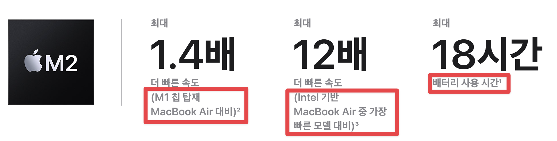기존 M1 칩과 비교했을 때 M2 칩의 성능은 아래와 같습니다.