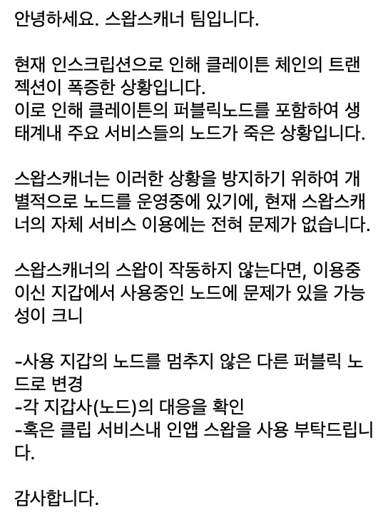스왑스캐너에서도 아래와 같은 공지가 떴습니다.