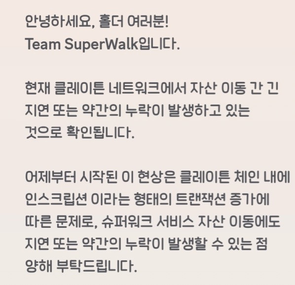 클레이튼 기반의 M2E 슈퍼워크에서도 관련 공지가 나왔습니다.
