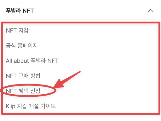 메뉴 중에 <NFT 혜택 신청>을 클릭합니다.