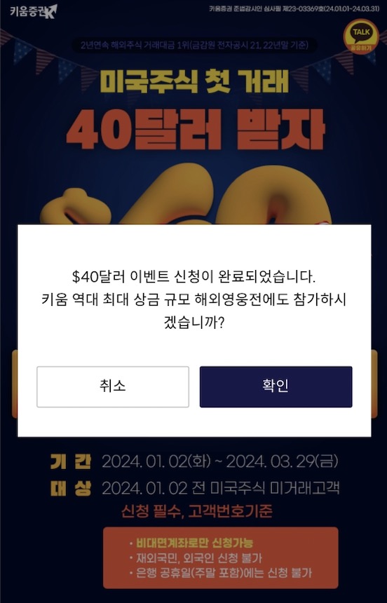 그리고 첫 해외주식인 경우 해외주식 투자금 40달러 받는 이벤트에도 신청합니다.