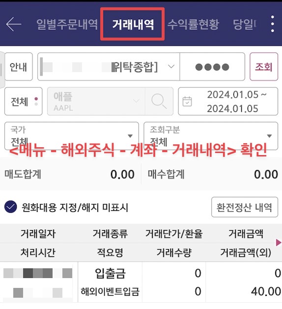 메뉴 - 해외주식 - 계좌 - 거래내역에서 확인할 수 있습니다.