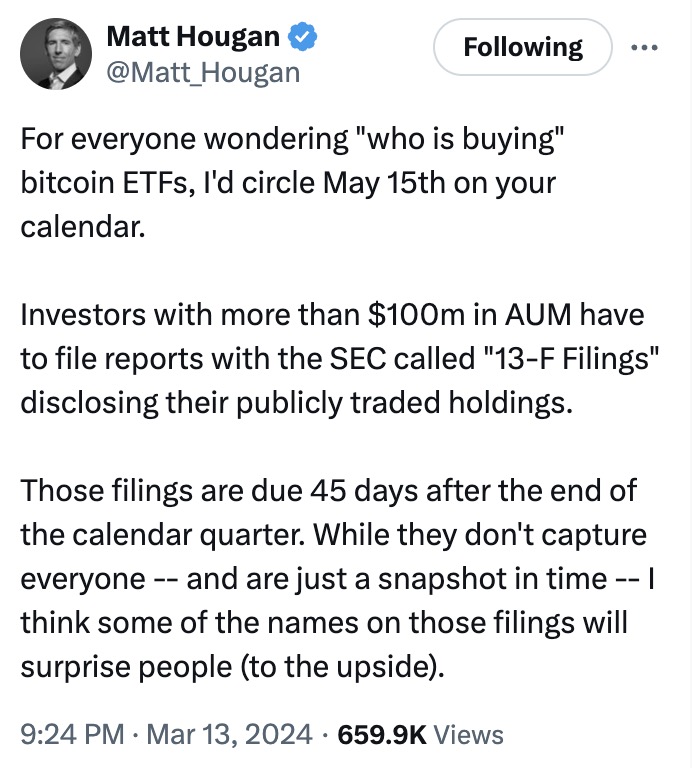 Matt Hougan은 사려면 5월 15일 이전에 사라고 합니다. 보통은 반감기 전에 매수하라고 하는데 이분의 논리는 이렇습니다. 왜 5월 15일이냐면 1분기에 ETF를 매수한 자본금 $100밀리언 이상의 기관들은 비트코인 ETF 매수보고를 분기 후 45일 안에 SEC에게 보고를 해야합니다. 그 때 일반인들은 비로소 수많은 대형 기관들이 비트코인 ETF를 샀다는걸 알게 되고, 깜짝 놀랄만한 이름도 있을 것이기 때문에 비트코인 가격은 더 올라 갈지도 모른다는 이야기입니다.