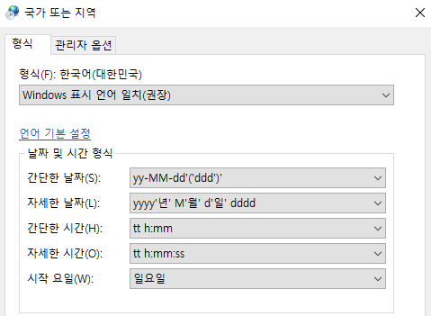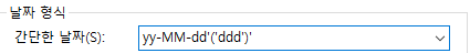 제어판 - 국가 또는 지역 에 들어가서 아래와 같이 간단한 날짜 부분을 수정합니다.