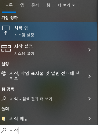 아래와 같이 윈도키 옆의 검색에서 '시작'을 넣어 '시작 앱'을 클릭합니다.