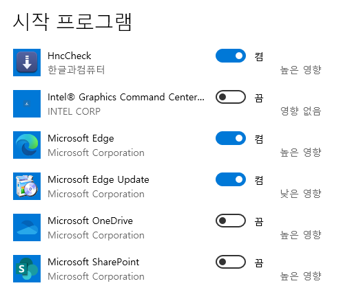 그리고 아래와 같이 컴퓨터 시작시에 자동으로 실행되는 것들 중에 불필요한 것은 끔 상태로 변경합니다. Hnc 로 시작하는 것은 아래 HncCheck 이외에는 광고 프로그램이므로 꺼두는 것이 좋습니다.